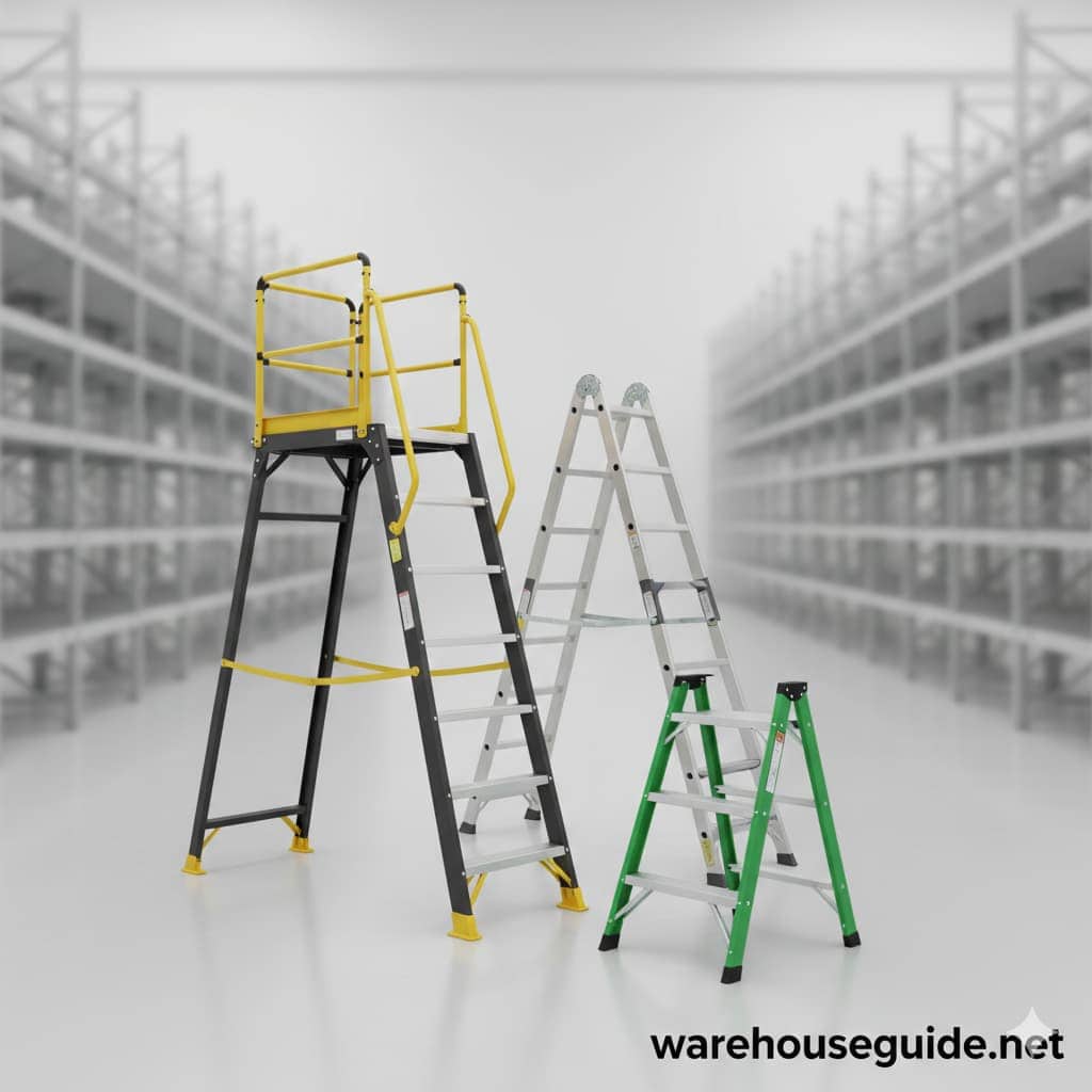 سلم منصة ثابت (Fixed Platform Ladder) | سلم ذو منصة في الأعلى ومزود بدرابزين حماية. الميزة: الاستقرار والأمان للأعمال طويلة المدى. | المخازن ذات الرفوف المتوسطة الارتفاع، خطوط التفتيش الثابتة. | دسر للمصاعد (للتصميم المخصص). |